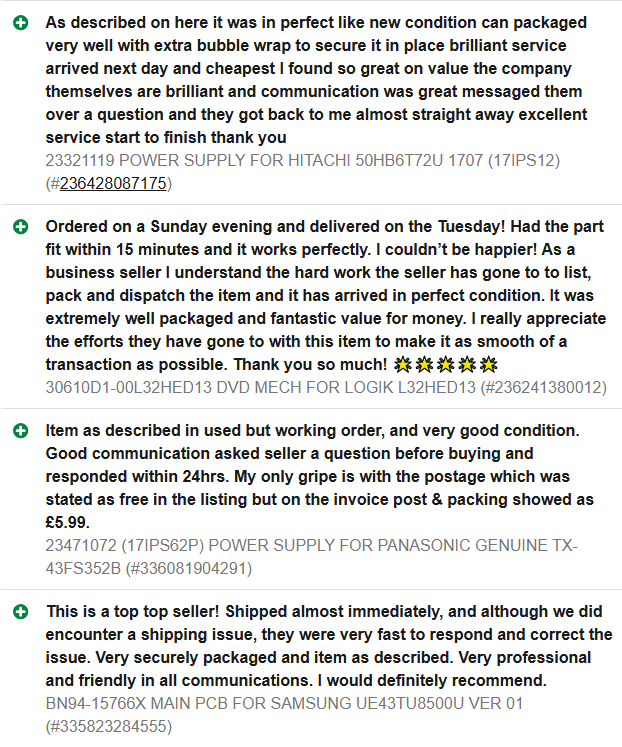Here is a selection of feedback from our eBay site This image shows how our customers rate our services Contact us